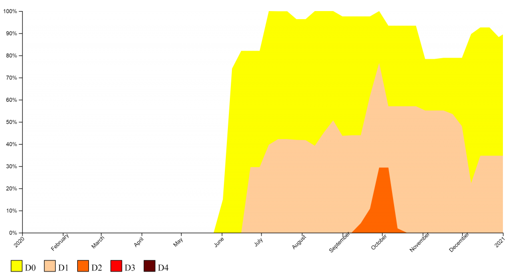The U.S. Drought Monitor started in 2000.  … The most intense period of drought occurred the week of September 29, 2020, where D2 affected 29.39% of Vermont land.